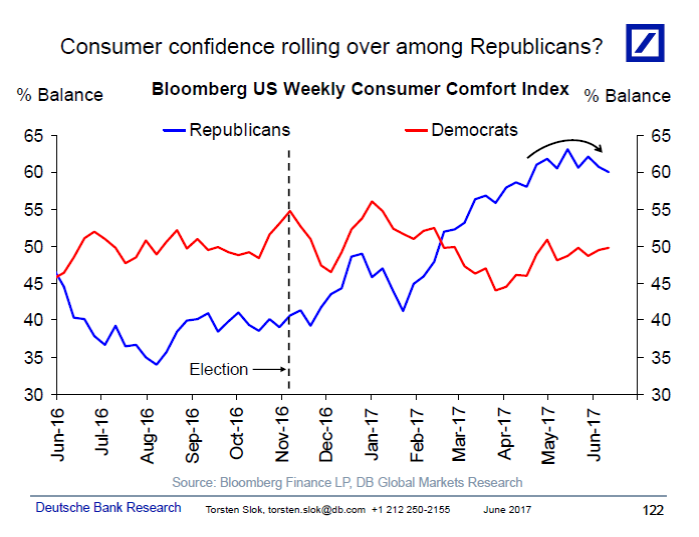 Det har kommit Consumer Confidence data från USA. Den är på en fortsatt hög nivå även om den troligtvis har toppat ur. Se nedan chart. Den visar att Demokraterna har blivit lite gladare senaste två månaderna. Inte så konstigt. Men den pekar också på att Republikanernas Trumpism tappat momentum men är på en fortsatt hög nivå. Jag tror det krävs en hel del innan den brakar i backen. Även om många skulle glädja sig över att Trump fick suga på egen medicin ”You are fired!”, så är det rent kapitalmarknadsmässigt inte bra för någon på kort sikt. Därmed inte sagt att det ska hända. Men hursomhelst tror jag Republikanernas support för sin president är en nyckelkomponent kommande 12 månader. Många i kongressen vågar inte vända Trump ryggen då det vore politiskt självmord så länge som folket gillar sin Donald. Men om stödet sviker är det nog många som skulle vilja sätta kniven i ryggen på honom.