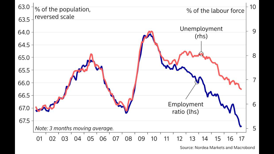 Sen tittar nog gärna Riksbanken på nedan graf. Den visar att 68% av befolkningen har ett jobb att gå till…… det har tidigare fört med sig lönebildning. Senast under 2007/2008. Kanske får de rätt igen?
