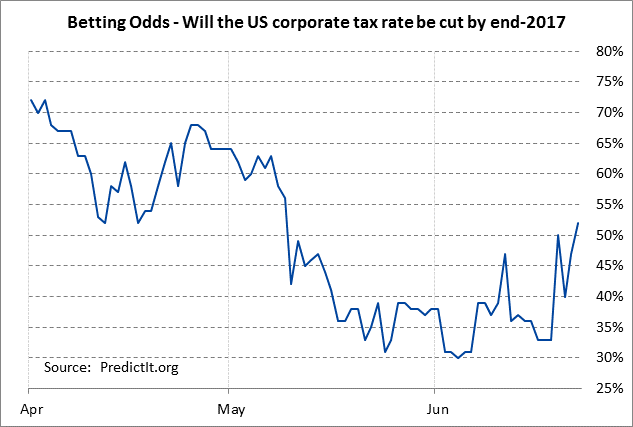 Chartet visar var de Amerikanska bettinginstituten tror om chanserna till skattesänkningar i år, baserat på oddsen. I mitten på April låg de på närmare 80%. De har sedan pyst ihop till 30% som lägst för nån vecka sen, men kan vara på väg upp igen. Skulle den här leta sig tillbaks till 75%+ så tror jag det är förenligt med bra börs.