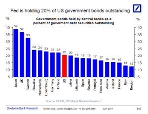 Apropå Qexit såg jag ovan chart. Som skulle få oss att tro att FED inte alls sitter särskilt tungt i statspapper. Medan Sverige ligger på tredjeplats. Jag tycker det här chartet är ganska vilseledande. Statsskulden i USA ligger på ca 100% av BNP. I Sverige ligger den på ca 30%. Det betyder att Riksbanken sitter på statspapper på ca 10% av BNP (33% X 30%). Samtidigt sitter USA på ca 20% av BNP (20% X 100%). Det är dubbelt så mycket. Japans centralbank sitter på drygt 100% av BNP. Är inte det sjukt!