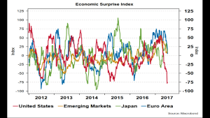I samband med att Trump vann så blåstes förväntningarna upp rejält. Det var framförallt rejäla skattesänkningar och en företagsvänlig politik som marknaden tog fasta på. Sentimentsindikatorerna gick i taket. Inte bara i USA. Ett halvår senare visade det sig att verkligheten inte riktigt lirade med de här förväntningarna, vilket rent konkret inneburit att datan kommit in sämre än väntat och surpriseindex vänt ner.