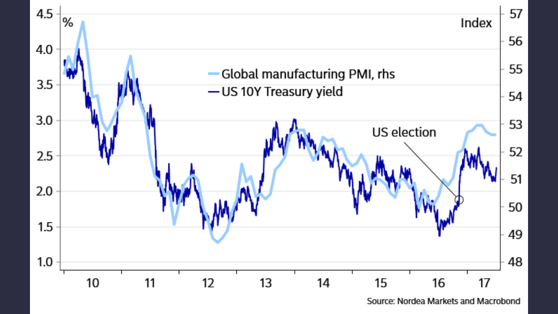 Faktum är att ser man till hur Globala Pmi’s har utvecklats senaste året så är det inte så konstigt att amerikanska räntor gått upp. Sen kan man diskutera, hur viktig har Trump varit för Global PMIs? Så här i efterhand är det tveksamt. Världen stod kanske ändå inför en konjunkturuppgång och en mindre expansiv Fed. Dvs Trump kan vara sekundärt?
