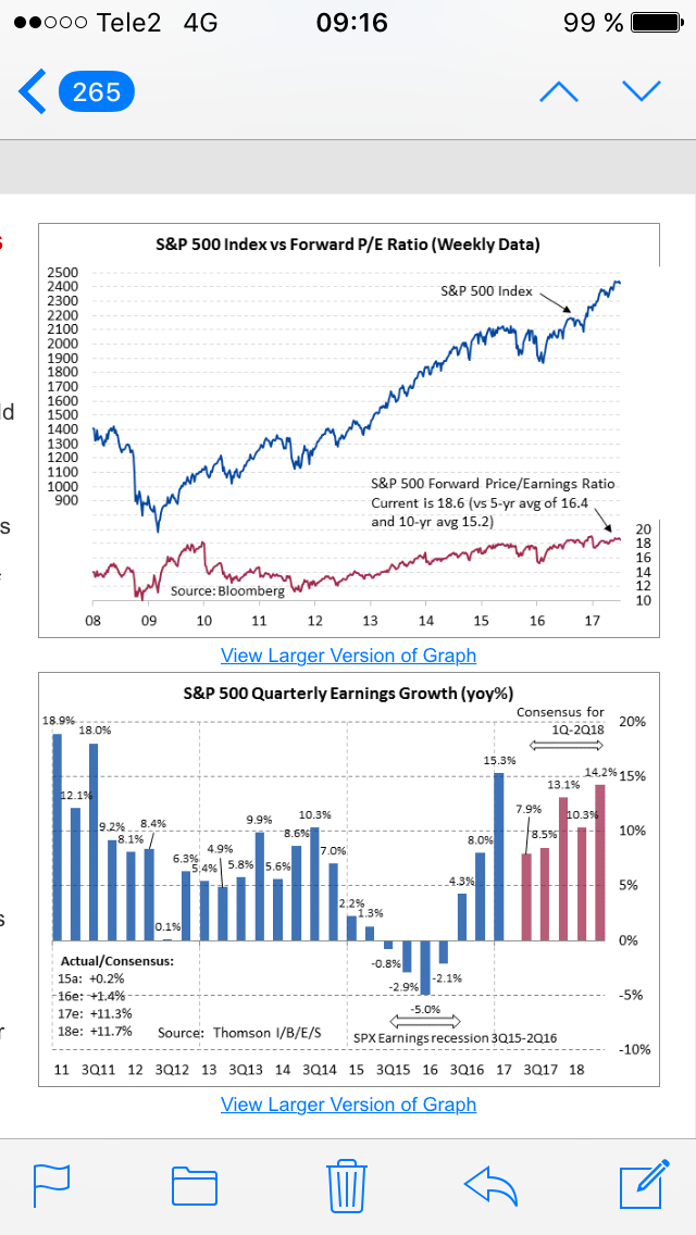 Det som slog mig var att innan Q1 orna presenterades i början av april så låg marknadens konsensus för SPX att bolagen totalt sett skulle tjäna ca 130 dollar per indexenhet för Helåret 2017. Sen rullade rapporterna ut och alla var euforiska hur bra dem var. Men när jag tittade hur estimatet hade ändrats för 2017 så låg det kvar på 130. NOLL i revidering. Estimaten nu, inför Q2, ligger kvar på ca 130 och det ska bli intressant när vi summerar i slutet av augusti var de tagit vägen. För stiger marknaden utan att vinstestimaten gör det så blir den dyrare. Sen kan man skriva hur mycket man vill om hur bra rapporterna är. Det skiter jag i!!! Okej, 2017 har varit lite av ett trendskifte då fg år så har praxis varit nedrevideringar i takt med att verkligheten inte levt upp till förväntningarna. Inga revideringar är bättre än negativa… men ändå. Stiger börsen utan att marknaden väntar sig högre vinster så blir den ju dyrare… just sayin!