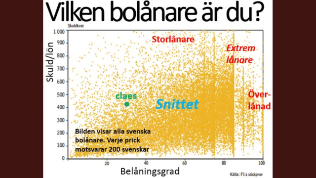 Sen en fråga mer av nyfikenhet. Är inte Claes Hembergs bild precis en sådan analys som du efterfrågat kring belåningen? Den är ju rätt skrämmande i mina ögon – en stor del av bolånetagarna har en belåningsgrad på över 500% och sedan är det även ett rejält gäng som har en belåningsgrad på över 700 – 800% – frågan är väl om denna del är tillräckligt stor för att någongång i framtiden sänka marknaden. Ockulärt från bilden så finns det absolut en rejäl risk för att så är fallet…