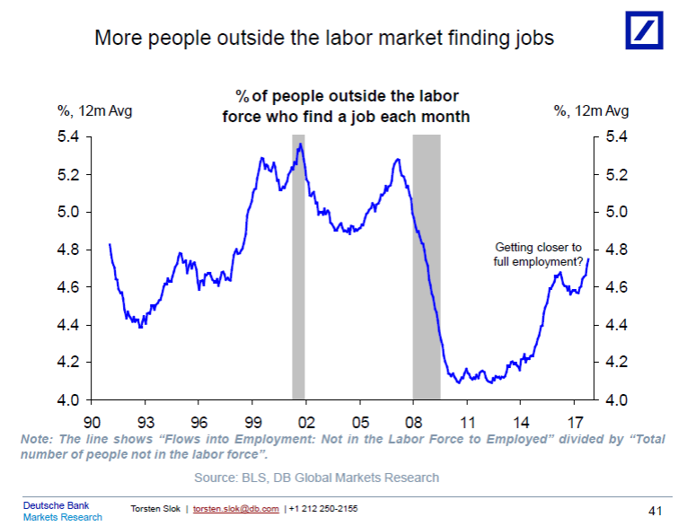 Såg nedan chart från Deutsche. Det första chartet på länge som visar att arbetsmarknaden INTE är lika tajt som under 07/00 konjan. Chartet visar hur lätt det är för folk som är utanför arbetsmarknaden att komma in och få ett jobb. Lite som att säga att arbetsmarknaden inte kan vara riktigt tajt förrän Amazon.com anställer en gammal kolgruvarbetare och utbildar honom i programmering. Av det enkla skälet att det inte går att få tag på relevant arbetskraft till rimliga pengar. Lite skämt och lite allvar. Jag tänker på utanförskapet i Sverige också.