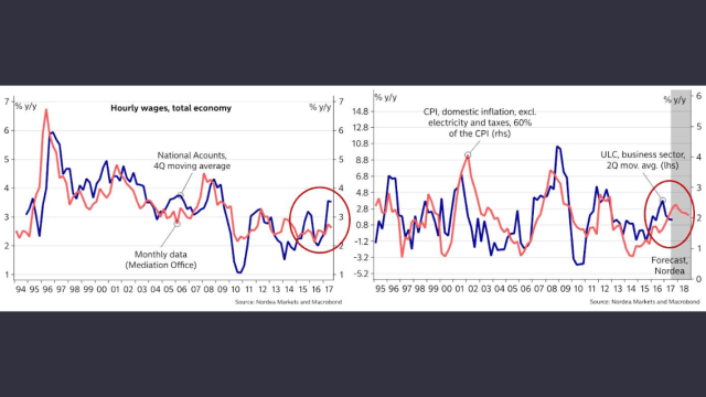 Nationalräkenskaperna visar på en uppväxling av de svenska lönerna. Men månadsdatan gör det inte. Datan som kom från SCB idag visade inte heller på någon ökning. Ser man till ULC, dvs Unit Labour Cost, så gör den inte det. Löneökningar högre än strax under 3% för riket är svårt att se. Alltså kan Riksbanken fortsätta att göra det dem gjort i flera år. Luta sig mot ECB… som föga överraskande inte heller ser några löneökningar eller inflation.
