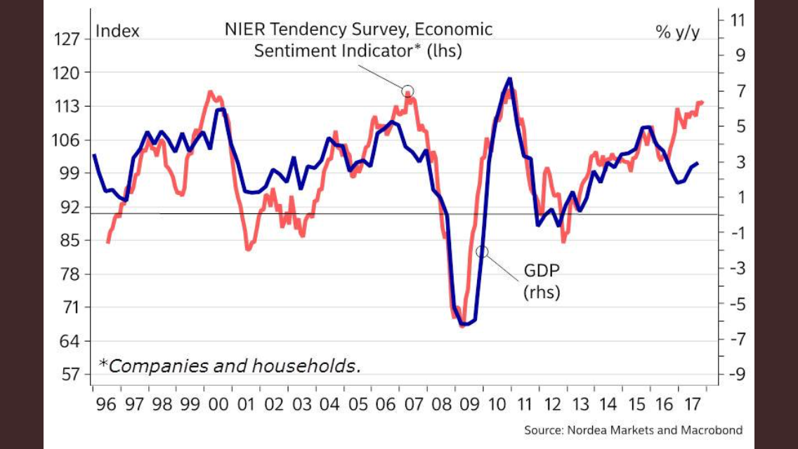 Sen kan man alltid fråga sig, är de för glada? BNP, dvs hårddata, lirar inte riktigt med Sentimentet, dvs mjukdata. Jag har ju svårt att tro att BNP ska växla upp till 6%. Snarare är det sentimentet som måste lugna ner sig lite. Se nedan