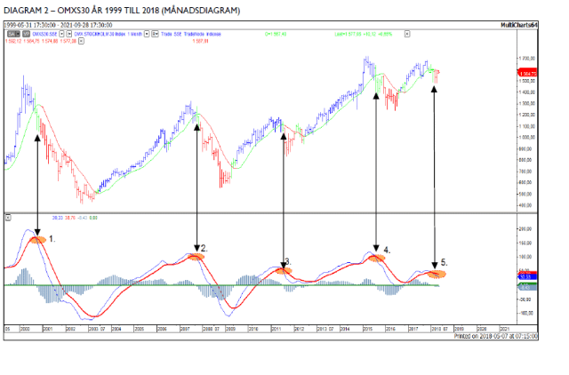 Den visar att vi fick en väldigt allvarlig säljsignal i vintras. En säljsignal som de senaste 20 åren varit dum att gå emot. Men kanske den här gången är det annorlunda. Han hintar att bryter vi upp nu, så dödar det i princip denna signal. Titta på 2006, då var det nära. Men någon säljsignal blev det tydligen inte. Därefter blev det rally fram till sommaren 2007. Då toppade det ur, 18 månader innan recessionen var ett faktum. Det är alltså inte orimligt med en topp i januari i år, om vi sen får recession i januari 2020. Det är tvärtom väldigt rimligt. Dvs Börsen toppar ur innan konjunkturen. Konjunkturen toppar ur innan recessionen. Fungerar likadant på andra hållet. Börsen bottnar i god tid innan konjunkturen bottnar, och konjunkturen bottnar naturligtvis innan det blir bättre tider. Detta är själva grundskälet till varför det är så svårt att sälja på toppen och köpa på botten.