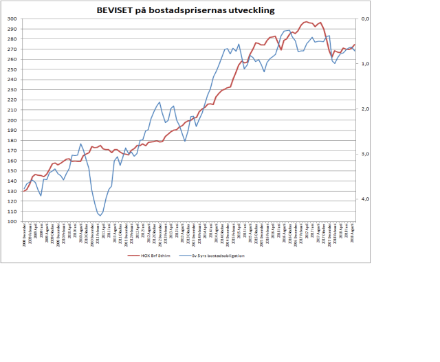 Häromdagen kom HOX/Valuegard med data över svenska bostadspriser. Siffran kom in snäppet bättre än väntat men ingen kioskvältare. Jag hade inte särskilt bråttom att uppdatera siffrorna för att de inte skulle visa nåt nytt. Hade lite tid över nu på eftermiddagen och gick in och laddade ner data från Riksbankens hemsida över räntorna på svenska bostadsobligationer. Men nåt ser konstigt ut. Bostadsobligationen låg på 0,71%. Va Fan! Den låg ju på typ 0,21% för en månad sen. Vad har hänt? Sen laddade jag ner en längre serie och ser jämfört med den jag publicerat under året att de har visat fel siffror hela året. Varje månad har de legat fel med ca 0,5 procentenheter. Jag jobbar ju inte med räntor och har därför inte reflekterat över det. Jag minns hur svenska statspapper gjorde ett hopp i januari men jag vet inte riktigt varför. Hursomhelst. Jag har tankat ner den nya serien och då framträder en ny bild. Räntorna har tidigare visat att det fanns en viss uppsida på bostadspriserna, typ 5-7%. Nu visar de istället att räntorna är i balans med priserna.