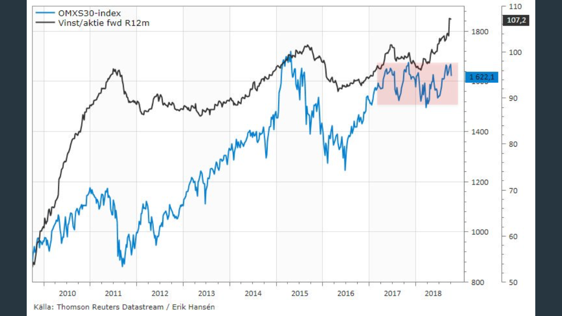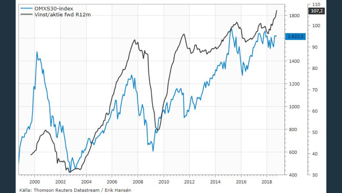 Erik visade några charts över svenska börsens utveckling. Riktigt fina!! Är du lite orolig över allt som händer så kan man alltid backa hem till the basic fact. Över tid reflekterar börsen vinstutvecklingen. Tror du inte att vinsterna kommer att trilla ner med 20-30% så behöver du inte vara orolig för din portfölj….
