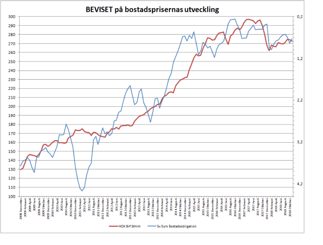 Ser man till den 5-åriga bostadsobligationen så är priserna i balans. Dock om Ingves börjar höja så finns det en uppenbar nedsiderisk. Detta enligt mitt resonemang att priserna bestäms av storleken på lånen, som bestäms av lånelöften, där kalkylräntan har störst betydelse, och där bostadsobligationen har ett direkt inflytande.