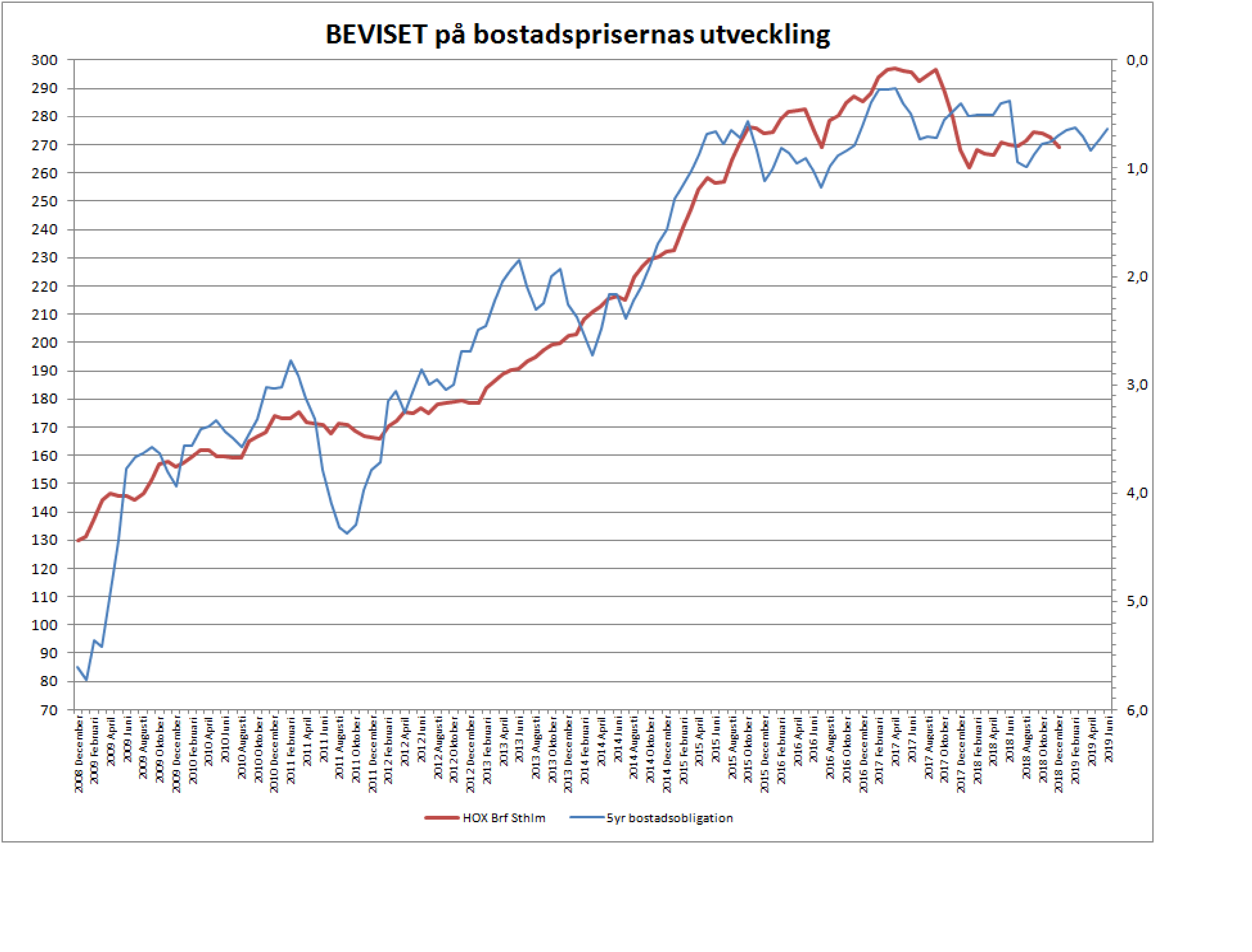 Grafen ovan visar faktiskt att det finns en uppsida på lägenhetspriser i sthlm på ungefär 5% fram till Midsommar nästa år. Jag skulle våga sträcka mig så långt att säga att de nog kan vara stabila fram tills dess. Anledningen är att svensk ekonomi ser ut att bromsa in ganska beskedligt, och då lär det lägga sig en viss försiktighet i marknaden. Ovanpå detta har vi överutbudet av nybyggda lägenheter. Men som sagt, inga kraftiga fall under våren. MEN, Ingves lär höja i nästa vecka från -0,5% till -0,25. Extrapolerar jag lite så kommer jag fram till att Bostadsobligationen kan börja stiga från dagens 0,64% till 1,25%. Det skulle i så fall indikera en 5% nedsida på bostadspriserna…. något som börjar kicka in efter sommaren. Jag tror ju Ingves kommer höja en gång till under första halvåret, trots inbromsning i ekonomin, och då kan bostadspriserna fortsätta ner ytterligare 5% från dagens nivåer fram till årsskiftet 19/20. Notera att jag pratar om lägenhetspriser i Sthlm.