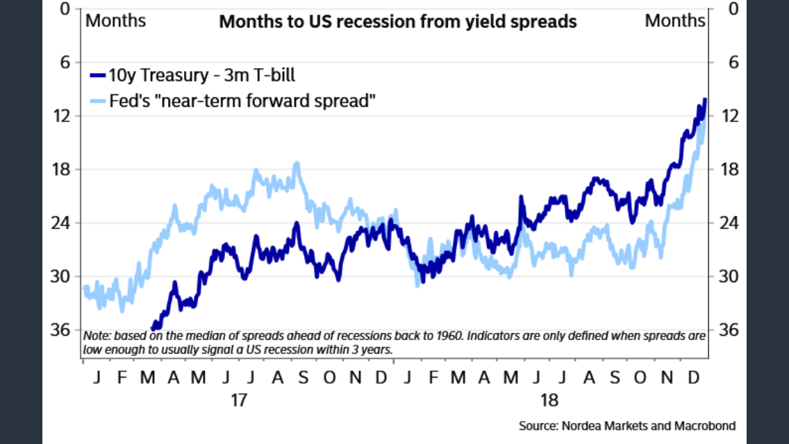 Nordea visar ungeför samma sak i grafen nedan. Dvs att räntemarknaden idag tror på recession 2020.
