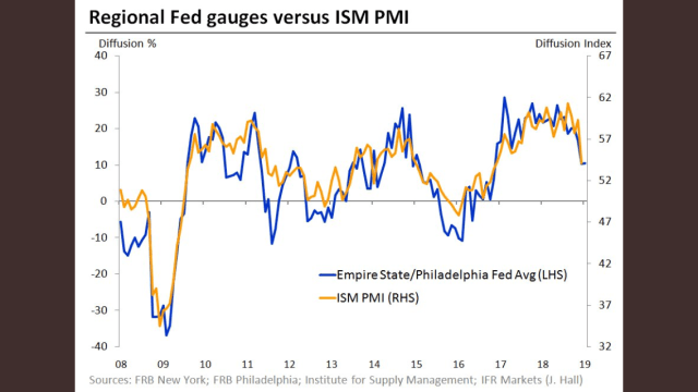 New York Empire FED kom för några dagar sedan in på 3,9 mot väntat 10,75 och fg 10,90. Svagt! Sen igår kom Philly Fed in på 17,0 mot väntat 10,0 och fg 9,4. Otroligt starkt. Egentligen var det bara lagerkomponenten som var svag, vilket inte är hela världen. Att man håller små lager är bra om efterfrågan tilltar. Det klassiska är annars att man har väldigt stora lager när goda tider vänder till dåliga, vilket gör att man stänger ner produktion och försöker kränga lagret istället. Vilket snabbar på nedgången. New Order komponenten var stark. Det är lovande. Sen kan jag tycka det kommer lite väl tidigt. Men ändå. Svag Empire och stark Philly. Hittade nedan chart på twitter som visar att mixen av dem indikerar att ISM kanske inte ska falla så mycket till….. det är ju intressant för alla oss som tror på soft patch, och inte recession.
