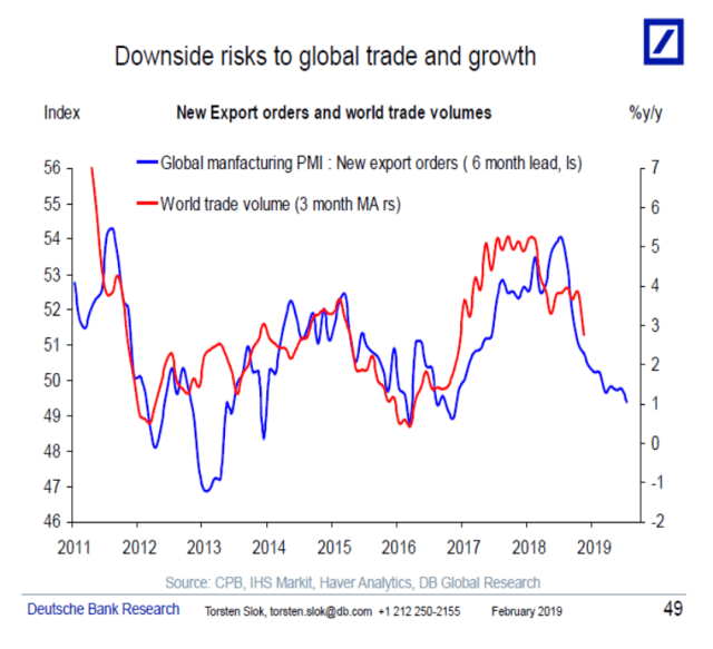 PMIs världen över pekar på en fortsatt inbromsning i världshandeln. Två saker ska ni lägga på minnet. 1, Det är inte recession a la 2009 som indikeras så här långt. Snarare Soft patch a la 2016 eller kanske 2013. 2, Börsen prisar in framtiden – handelsdata är laggande. … i takt med att handelsdatan rullar in dåligt under året, och det skrivs negativt om den, så är det ingen data du bör agera på. Du bör då säga ”det här har jag vetat om sen hösten 2018 – det enda som är intressant vad den kommer att vara längre fram”.