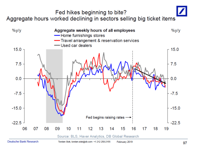 Den här är inte så konstig. Den visar hur momentum avtar i bil-möbel och resebranschen. Det är inte så konstigt. Ekvationen är enkel. Ta alla jobb X deras lön, dra i från räntekostnader, korrigera sen för inflation i basvaror som mat, energi osv. Det är vad man har över till guldkanten i livet. Gör en graf som visar YoY%, och du kan prognostisera konsumtion. Skapas det färre jobb, lägre löneökningar, högre räntekostnader, dyrare mat och bensin. Ja då blir det sämre. Går det åt andra hållet, ja då blir det bättre. Just i det här fallet får man nog säga att de flesta faktorerna varit ganska så stabila, och det är framförallt FEDs 9 höjningar som gör bilköpet mindre lockande.
