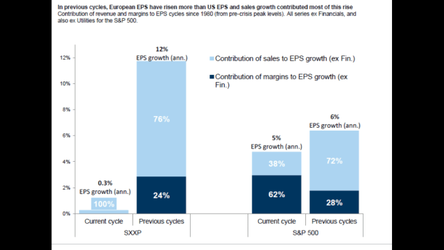 Den visar att Europa i tidigare konjunkturer uppvisat 12%/år vinsttillväxt, där merparten kommer från top line growth. I den här cykeln ligger den på 0,3%. Tror ni Europeiska företag är intresserade av att höja lönerna. I USA ser det bättre ut. Men väldigt lite har kommit från top line. Det mesta har kommit från dassiga löner, låga räntekostnader, mindre investeringar och skatter. Tror ni Amerikanska företag har jätteincitament att höja löner i soft patch?