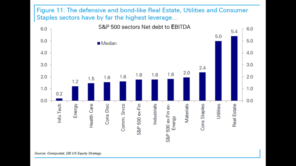 Nedan chart gjorde mig väldigt glad. Amerikanska börsbolag har senaste åren varit väldigt aggressiva i att dela ut pengar till sina aktieägare och köpa tillbaka och makulera aktier. En del av detta har skett med vinstmedel, men mycket har gjorts med nya lån, varpå skuldsättningen har ökar. Vilket jag har rapporterat om tidigare. Men nedan chart visar att skuldsättningen är en sektor fråga.