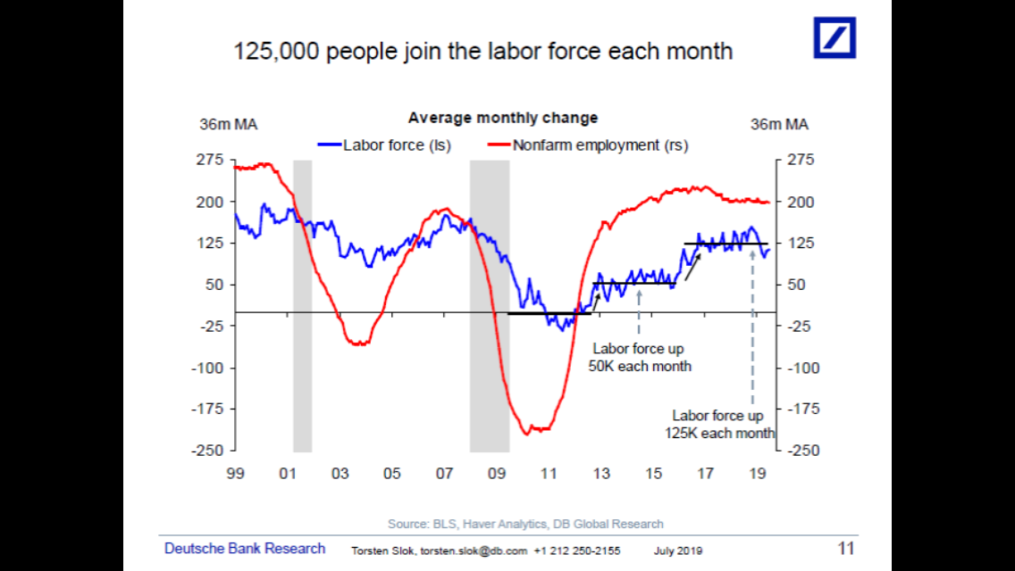 Nedan är väldigt intressant. Varje månad sista tiden har det tillkommit i snitt 125k arbetssökande till amerikanska arbetsmarknaden. Lite färre än de nya jobb som skapats. Man pratar ju gärna om hur tajt arbetsmarknaden är. Men hur tajt kan den vara om det hela tiden sker ett stort inflöde av människor.