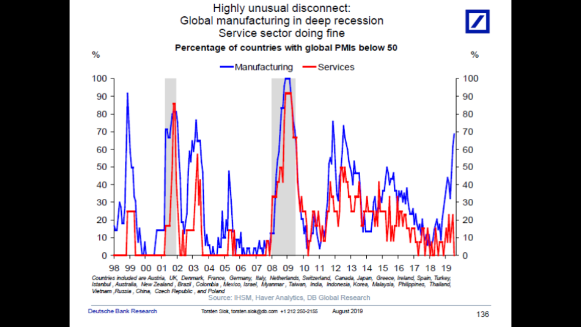 Nedan chart visar hur tillverkningssektorn tagit rejält med stryk i världen. Vissa skulle kalla det recessionsnivå, andra säger att det är en slowdown likt 2012. Men potentialen är betydande om vi får ett handelsavtal. Dock ligger det långt borta just nu. Vad som är synnerligen intressant är hur tjänstesektorn håller sig. Vissa skulle säga att den bara laggar mfg. Delvis håller jag med. Men en stor anledning till att den kan fortsätta att gå bra, och därmed få oss att undvika recession, är att räntorna världen över är låga. Hushåll, stater och företag har fortsatt låga räntekostnader, och kan spendera pengarna på annat. Tjänster. Inflationen som globalt fenomen har aldrig velat ta fart. Precis som lönerna. Det är värt att tänka på….