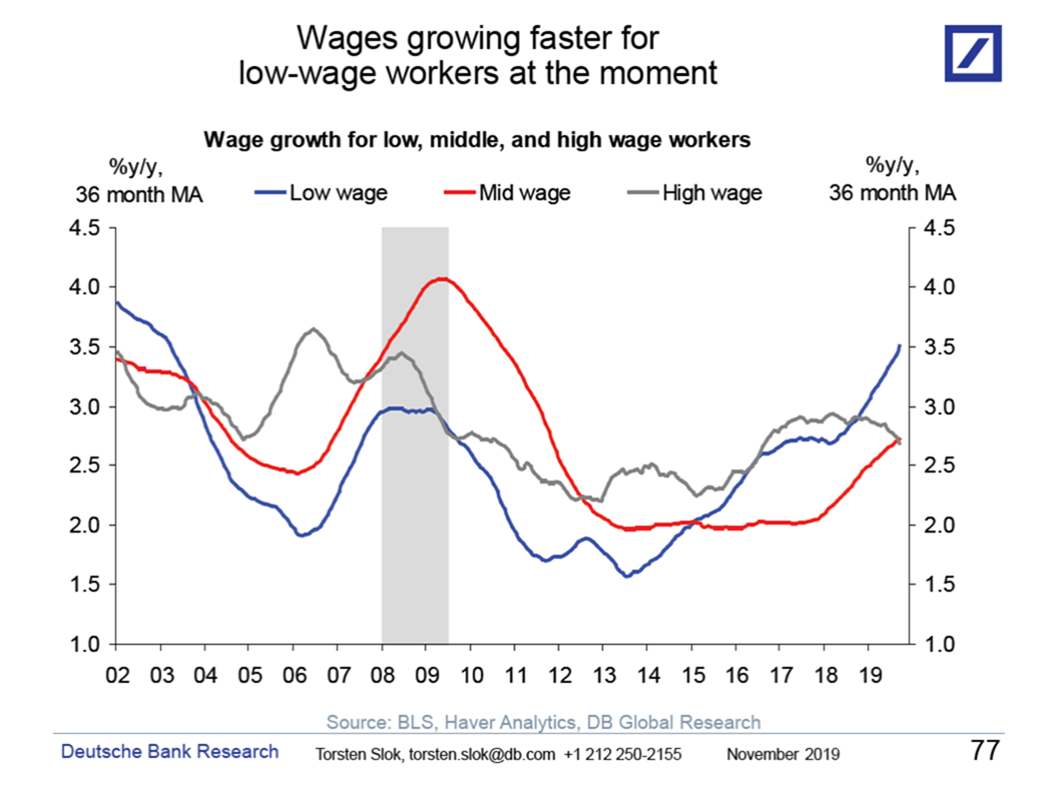 Den visar lönerna för låg, medel och höginkomsttagare i USA. Min analys är följande. Hög inkomsttagarna driver ingen inflation. Deras löner är kopplade till hur lönsamma bolagen är. Som under senaste tiden när lönsamheten planat ut. Då stannar deras löner. Låginkomsttagarnas löner borde teoretiskt vara inflationsdrivande, då det bara är tajtheten i deras A-marknad som driver dem. Men eftersom lönerna totalt sett är små så är de inga stora kostadsdrivare i företagen och därför är de inte heller inflationsdrivande. Därför har de kunnat stiga sedan 2013 utan att de påverkat inflation, och räntor så mycket. Nyckeln är Mid-lönerna. De flesta ingår i den här kategorin, och de utgör den stora kostadsposten bland företagen. Det var dem som till slut tryckte upp inflationen och räntorna vid förra krisen.