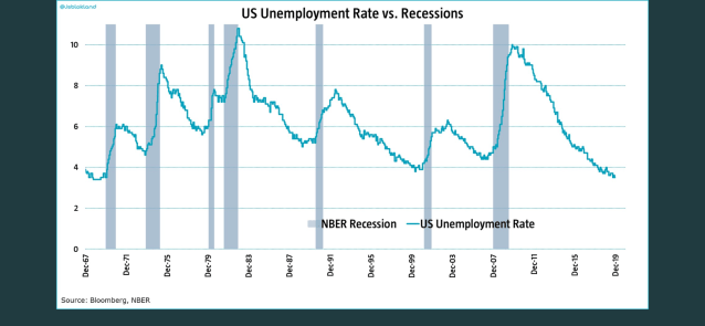 Tror ni det är låg arbetslöshet som skapar recessioner? Något i stil med att om arbetslösheten är extremt låg så kan inte fler få jobb, och skapas det inga nya jobb så dör konjunkturen och slår över i recession? Många tror det. Men det är fel. Anledningen till att recession oftast inträffar när det är låg arbetslöshet är följande: När arbetslösheten blir tillräckligt låg så blir arbetsmarknaden tajt. Det innebär att man inte hittar nån arbetslöshet på gatan utan är tvingad att anställa någon som redan har jobb. För att locka över denna person måste man höja lönen. Denna löneuppgång sprider sig sen bland dem som inte byter jobb. Lönerna stiger. Eftersom det är ett företags största fasta kostnadspost så stiger kostnaderna. För att försvara vinsterna höjer företagen priserna på sina varor och tjänster. Det är initialt inget problem för att folk tjänar mer. Men när priserna stiger så stiger den uppmätta inflationen. Eftersom centralbanker har ett inflationsmål blir oroliga för framtida överhettning. De höjer räntan, och alla hushåll och företag med lån får se sina räntekostnader stiga. Det är egentligen inget problem i sig, men eftersom lånen generellt är större än inkomsterna så ökar till slut räntekostnaderna snabbare än inkomsterna. Disponibelinkomsterna efter räntekostnader vänder ner och konsumtionen tvingas ner. Med den vänder tillväxt och konjunktur ner. Tillgångspriser reflekterar denna nedgång och hjulen är satta i snurrning, mot recession.