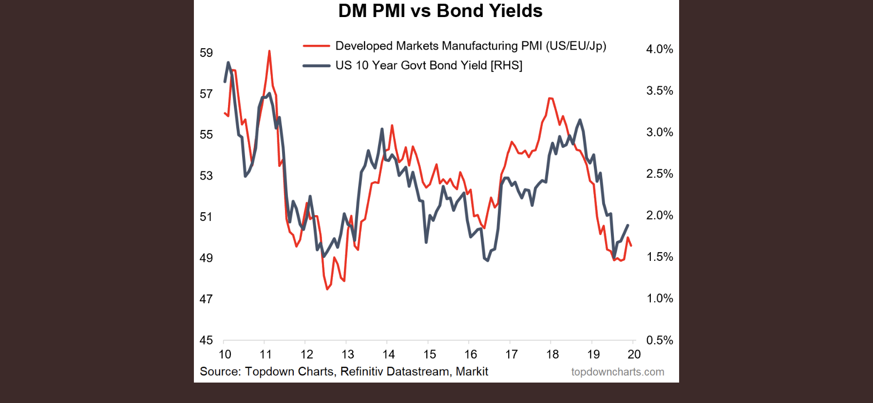 Nedan chart är enkelt och bra. PMIs leder ju den ekonomiska utvecklingen, men Räntorna har haft en smått ledande effekt på PMIs. Inte så konstigt. Om räntorna stiger så stiger räntekostnaderna, och då kan man investera och konsumera mindre. Men chartet visar ju precis tvärtom tänker någon??? Precis… Stigande räntor är orsaken till inbromsningen varpå PMIs faller. På grund av inbromsningen har FED förändrat sin politik varpå räntorna har gått ner, och det är nu de fallande räntorna som kommer att ge stigande ekonomisk aktivitet vilket kommer att visa sig i form av stigande PMI. Men på grund av stigande ekonomisk aktivitet så stiger även räntorna. Vid dagens styrränta om 1,50/1,75 så räknar jag med att 10-åringen jobbar sig upp mot 2,50% nästa år. Det skulle i så fall vara synkront med Global Mfg PMI på c53.