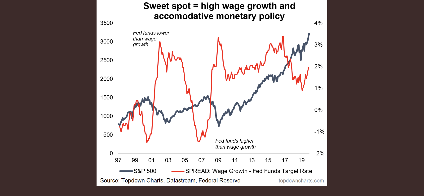 Idag ligger lönerna på 3% och mycket riktigt har vi en inflation strax under 2%, mätt som core PCE. Det får inte FED att ligga sömnlös som vi alla vet. Men skulle lönerna dra mot 4% och ekonomin växa med 3%, något jag INTE ser framför mig nästa år men med stor risk 2021, så kommer FED ta fram storsläggan.