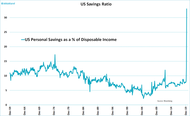 Nedan chart är viktigare än de korttidspermiterade för köpkraften. Den visar att sparandet skjutit i höjden under Corona. Dels för att man är rädd, och dels för att man tvingats sitta hemma. Notera att sparande är samma som minskad konsumtion. Notera också att lika snabbt som den går upp kan den gå ner om ekonomin rullar igång igen och confidence hittar tillbaka. Det är just därför som alla dysterkvistar som tror på långtgående bestående effekter av Corona kan få sig en rejäl kallsup senare i höst….
