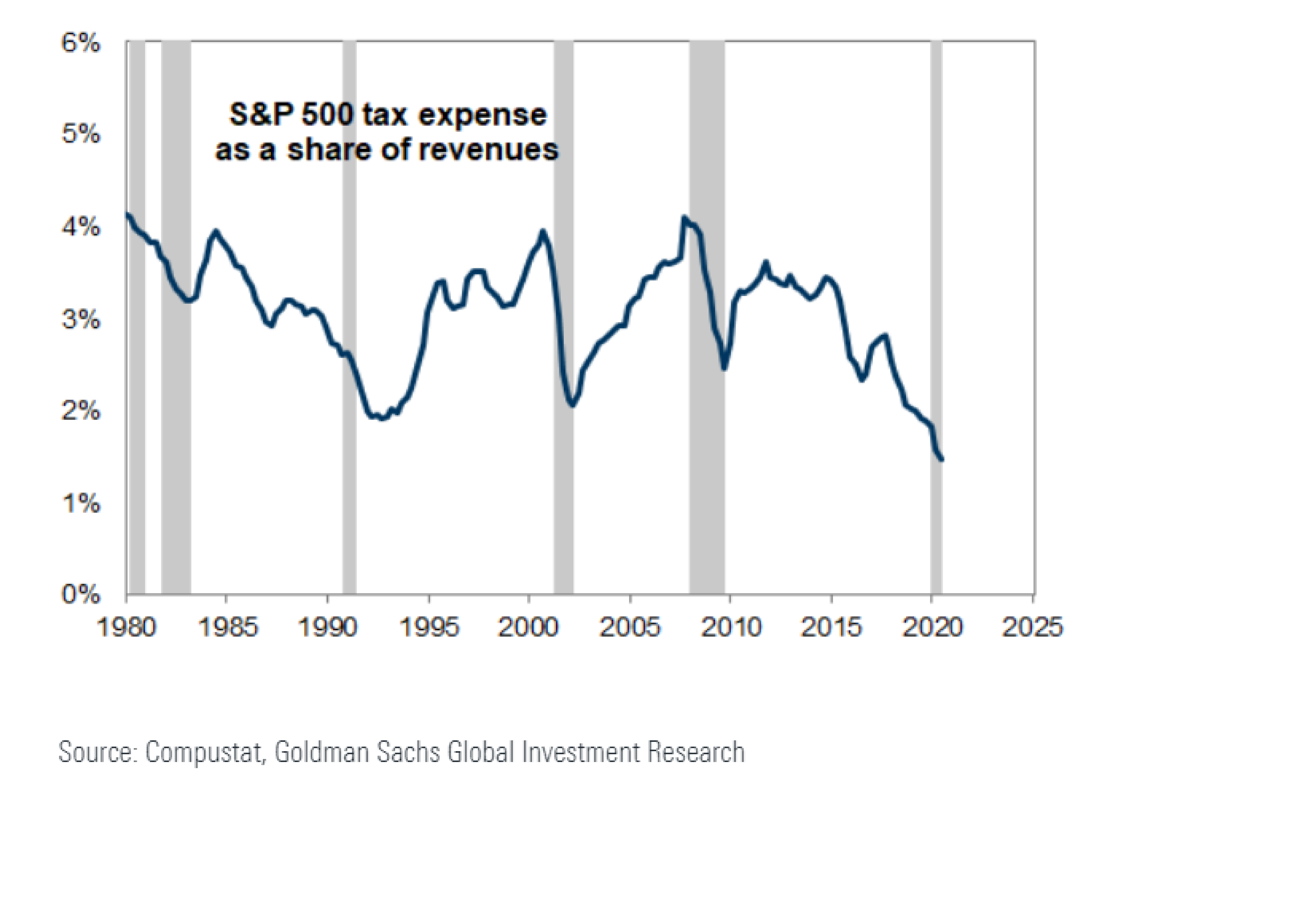 Min gissning är att Biden vill normalisera den här grafen under sin mandat period. Eftersom Vinstmarginalen på sista raden för SPX bolagen ligger på 10% så skulle en höjning mot 4%, top of range, allt annat lika innebära att vinsten blir 25% lägre. Senaten kommer ju aldrig tillåta detta, med någon typ av gradvis normalisering är att vänta 2022 och framåt. Nu tänker ju inte Biden köra nån åtstramningspolitik, vare sig nästa år eller därefter, utan han vill sätta sprätt på pengarna, vilket egentligen gynnar Trumps kärnväljare.