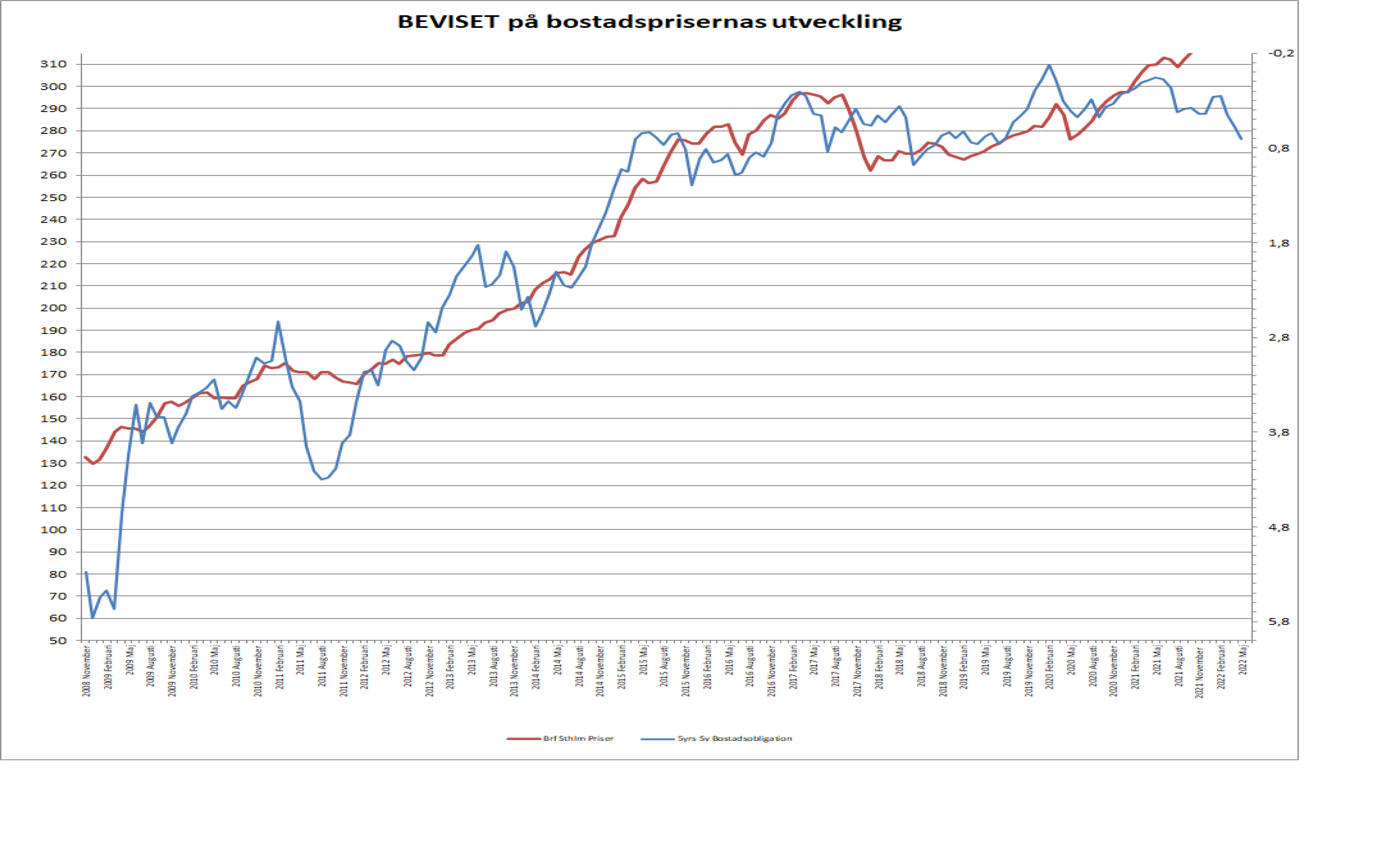 Lite intressant ändå att man får gå tillbaka ända till 2011 när bostadsobligationen drog under några månader. Den gången gick det bra. Marknadspriserna ”hann” inte anpassa sig, och räntan föll tillbaka igen. Kan det hända igen? Tja, slungas vi in i en recession nästa år, så kommer det bli noll och inget av FEDs hökighet, och alla kommer kasta sig över trygga bonds vars räntor då faller som stenar. Även vår kära bostadsobligation kommer att ryckas med i fallet och sjunka…. och då hamnar priser och ränta i balans igen. Så summasumarum, tror du på en måttlig recession nästa år, där Sverige står sig hyfsat starkt… ja då kan nog bostadspriserna ligga kvar på dagens nivåer. Men tror du inte på recession, som jag gör, då ska svenska bostadspriserna (eller rättare sagt Brf Sthlm) ner med 15% närmaste 2 åren.