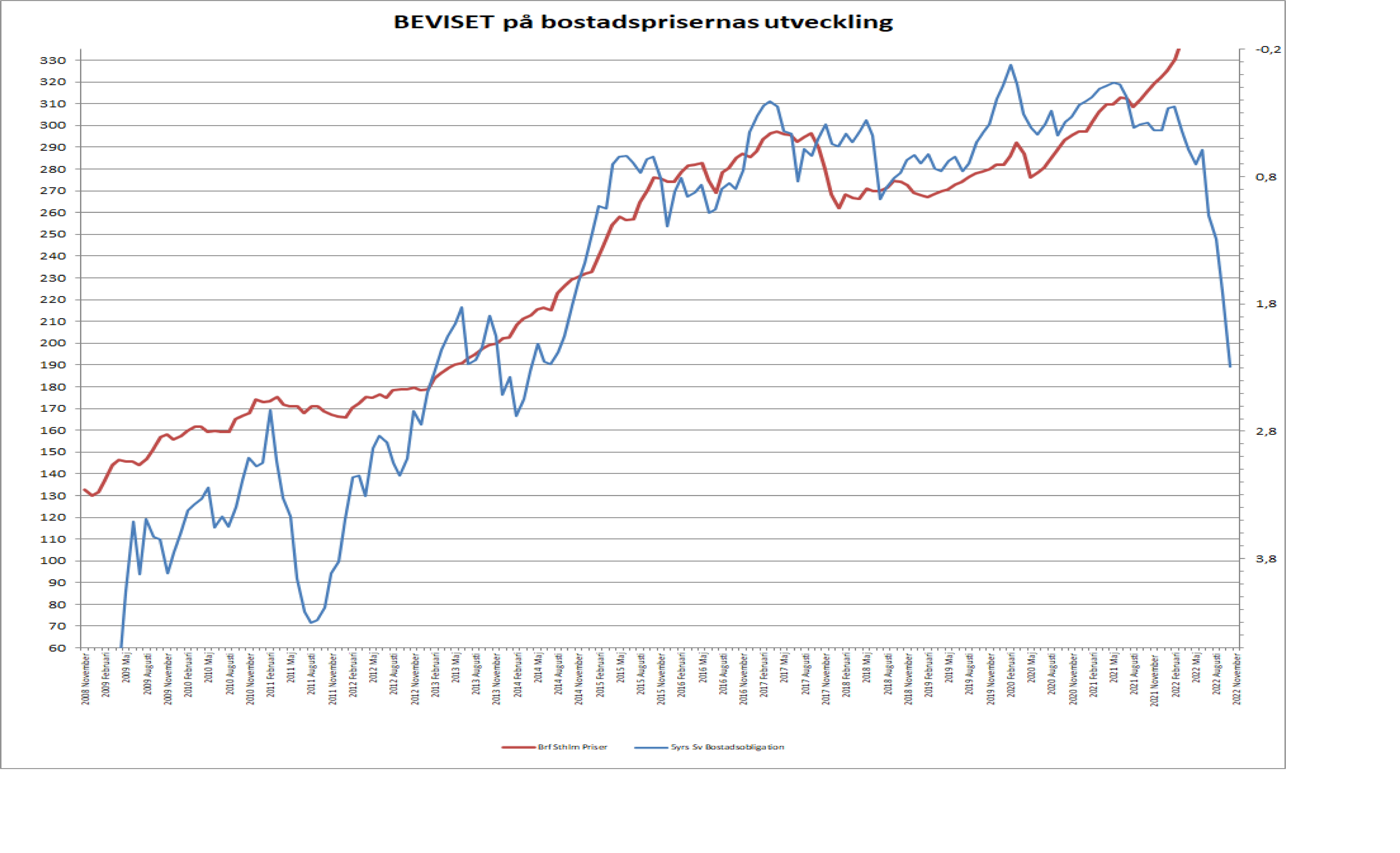 Det är inte heller fallet i bostadspriser som är problemet i sig, utan bara ett symptom av problemet. Det är stigande räntor som är problemet. Lika lite som att den genomsnittlige svensken får rätta sitt levnadsmönster efter lönen, trots att värdet på bostaden ökat med en årsinkomst. Han betalar inte restaurang besöket med tegelsten. Visst, vissa belånar bostads för konsumtion, men den summan pengar är försumbar i förhållande till totalen. Lika lite hade det varit ett problem om priserna halverades, men räntekostnader och konjunktur varit oförändrade. Men det är dom såklart inte utan de hänger ihop. Vill bara belysa bostadspriserna som en funktion av själva problemet. De är inte problemet i sig.